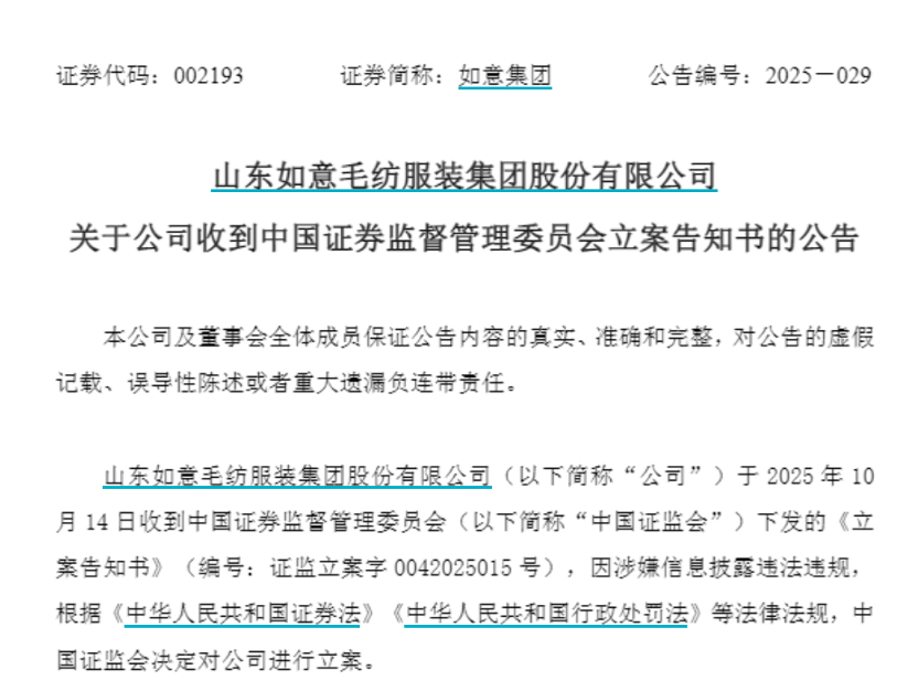 如意集团(维权)(002193)10月14日晚间公告,公司于2025年10月14日收到中国证监会下发的《立案通知书》,因涉嫌违反信息披露法律法规,中国证监会监管机构已对公司立案立案。公司正在积极配合调查并履行信息披露义务。目前,公司生产经营正常,本次备案不会对公司产生重大影响。